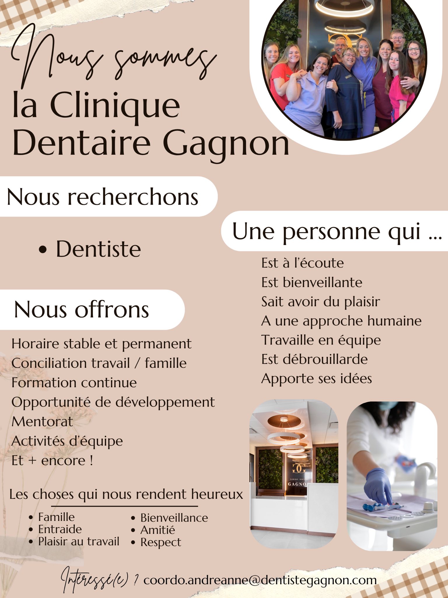 | Description | We are looking for a colleague who wants to practice quality dentistry in a warm environment where support, enjoyment, and self-improvement are a priority. Full-time or part-time position. We are here to work as a team and help you have a career that reflects who you are, without pressure. |
